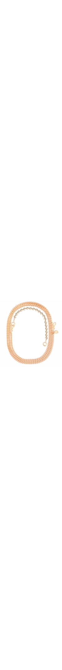 A alça dourada é produzida por corrente dourada em aço com banho de imersão e verniz incolor. A peça de modelo elus possui espessura média, gancho metalizado aplicado na ponteira, tag da marca metalizada aplicada e acompanha por alça de pérolas com ganchos metalizados na ponteira para ajuste.