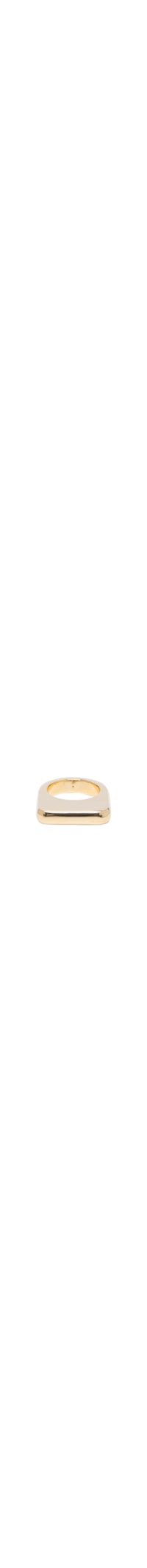 O anel dourado é produzido em metal com banho de ouro 18K A peça possui espessura média, parte superior em formato retangular com bordas arredondadas e acabamento polido.