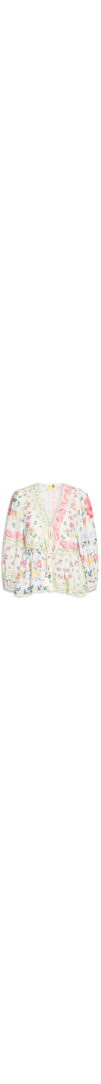 A bata off white é confeccionada em tecido leve sem elasticidade. A peça solta ao corpo possui decote V profundo, mangas 7/8 com elástico embutido nos punhos, abertura frontal com aplicação de cordões alongados com detalhes em tássel, recorte na parte inferior com efeito de babados, aplicação de detalhes em crochet na barra e na abertura frontal e fechamento frontal por amarração.