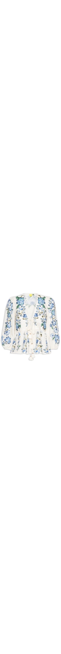 A bata branca é confeccionada em tecido leve sem elasticidade. A peça solta ao corpo possui decote V profundo, mangas 3/4 com elástico embutido nos punhos, mix de estampas em cores contrastantes e fechamento por amarração frontal com aplicação de tassel.