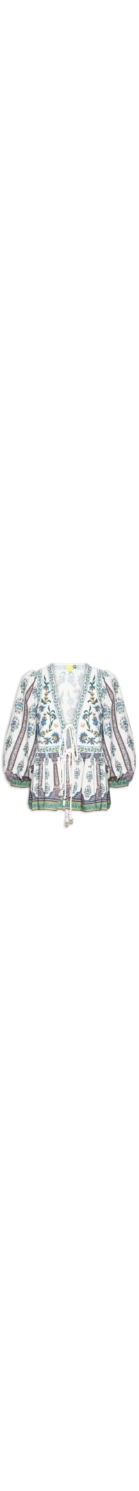 A bata branca é confeccionada em tecido leve sem elasticidade. A peça solta ao corpo possui decote V profundo, mangas 3/4 com elástico embutido nos punhos, mix de estampas em cores contrastantes e fechamento por amarração frontal.