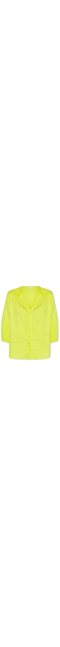 A bata verde é confeccionada por tecido leve sem elastcidiade. A peça solta ao corpo possui decote V, mangas 7/8 com elástico embutido nos punhos, recorte na altura do ombro frontal e posterior e fechamento por botão frontal.