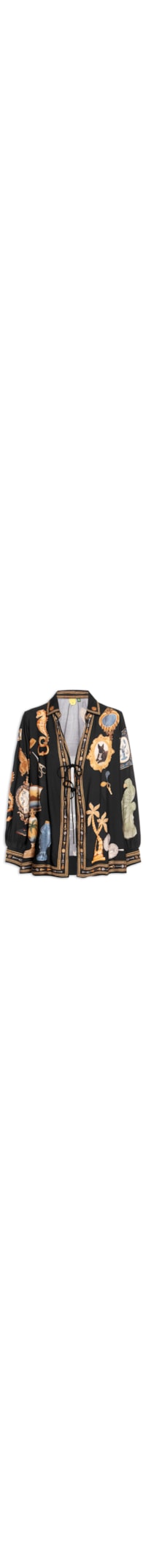 A bata preta é confeccionada em tecido leve sem elasticidade. A peça solta ao corpo possui gola esporte, abertura frontal com tiras finas, mangas longas com recorte e aplicação de lastex no punho, mix de estampas em cores contrastantes e fechamento frontal por amarração.