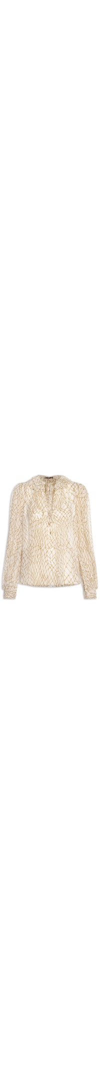 A bata bege é confeccionada em tecido leve sem elasticidade. A peça solta ao corpo possui decote V com babados, aplicação de lastex e tiras finas embutidas para amarração, mangas longas com aplicação de lastex no punho, barra arredondada, estampa em cor contrastante e transparência.