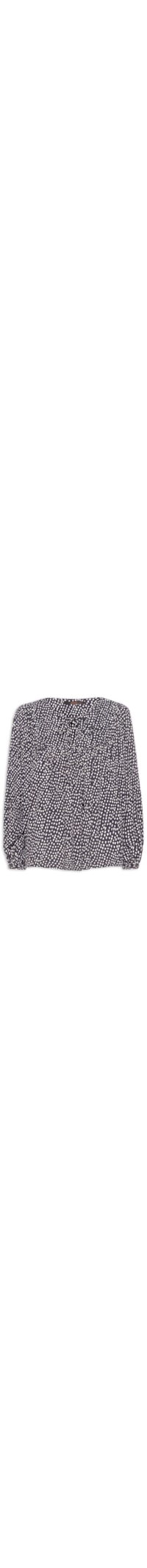 A bata preta é confeccionada em tecido leve sem elasticidade. A peça solta ao corpo possui decote arredondado, mangas longas bufantes, recorte vazado na parte frontal, tiras aplicadas para amarração frontal, recorte posterior e estampa figurativa em cor contrastante.