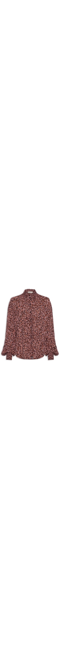 A bata marrom é confeccionada em tecido leve sem elasticidade. A peça solta ao corpo possui colarinho simples com aplicação de lastex, mangas amplas e longas com lastex no punho, recortes frontais e posteriores, estampa em cores contrastantes, barra arredondada e fechamento frontal por botões.