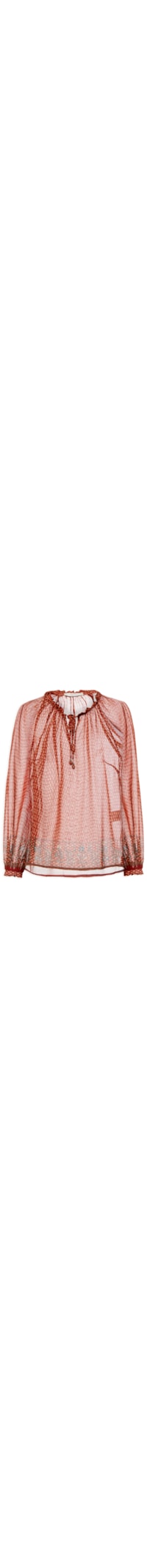 a bata Vermelha é Confeccionada Em crepe Sem Elasticidade. A Peça Solta Ao Corpo Possui Decote Redondo Com Detalhe De Franzido E Recorte Em V, Mangas Longas, Cordões Alongados Na Altura Do Decote Para Amarração, Pences Na Altura Do Busto, Mix De Estampas Em Cores Contrastantes, Transparência E Fendas Laterais Curtas.