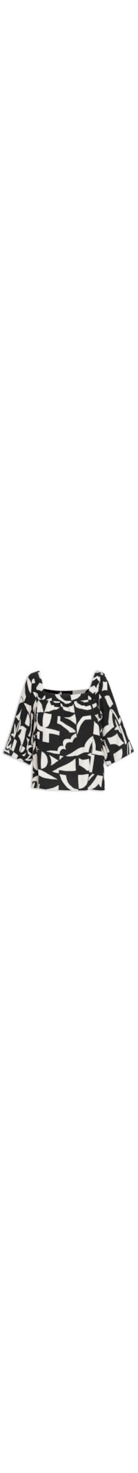 A bata preta é confeccionada em tecido leve de alta elasticidade. A peça solta ao corpo, possui decote quadrado, mangas curtas amplas, recorte frontal, leve franzido frontal e posterior e estampa abstrata em cores contrastantes.