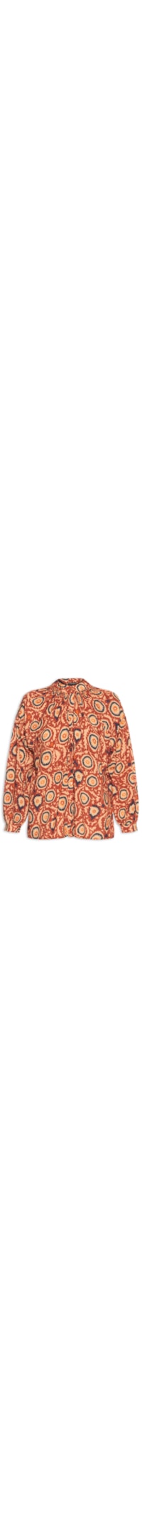 A bata marrom é confeccionada em tecido leve sem elasticidade. A peça solta ao corpo possui colarinho padre e lastex embutido, mangas longas com abotoamento nos punhos, mix de estampa abstrata em cores contrastantes, barra com acabamento arredondado e fechamento frontal por botões.