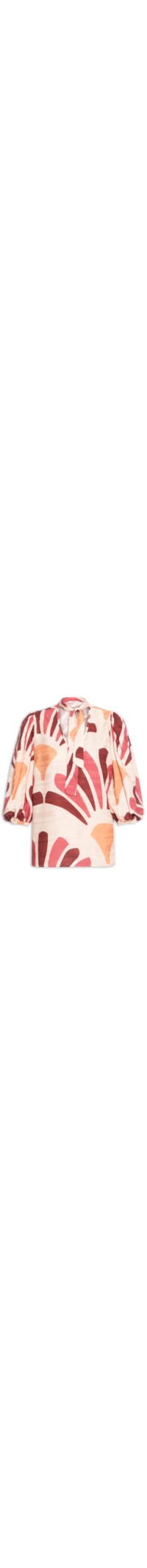 A bata bege é confeccionada em tecido leve com toque de linho sem elasticidade. A peça solta ao corpo possui decote V com faixas médias para amarração frontal, mangas 3/4 bufantes e estampa abstrata em cores contrastantes.