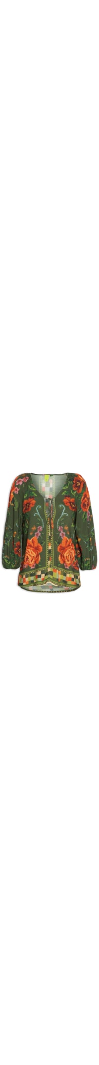 A bata verde é confeccionada em tecido leve sem elasticidade. A peça solta ao corpo possui decote V profundo com tiras estendidas para amarração, mangas 3/4 de modelo raglan com elástico embutido nos punhos e mix de estampa em cores contrastantes.