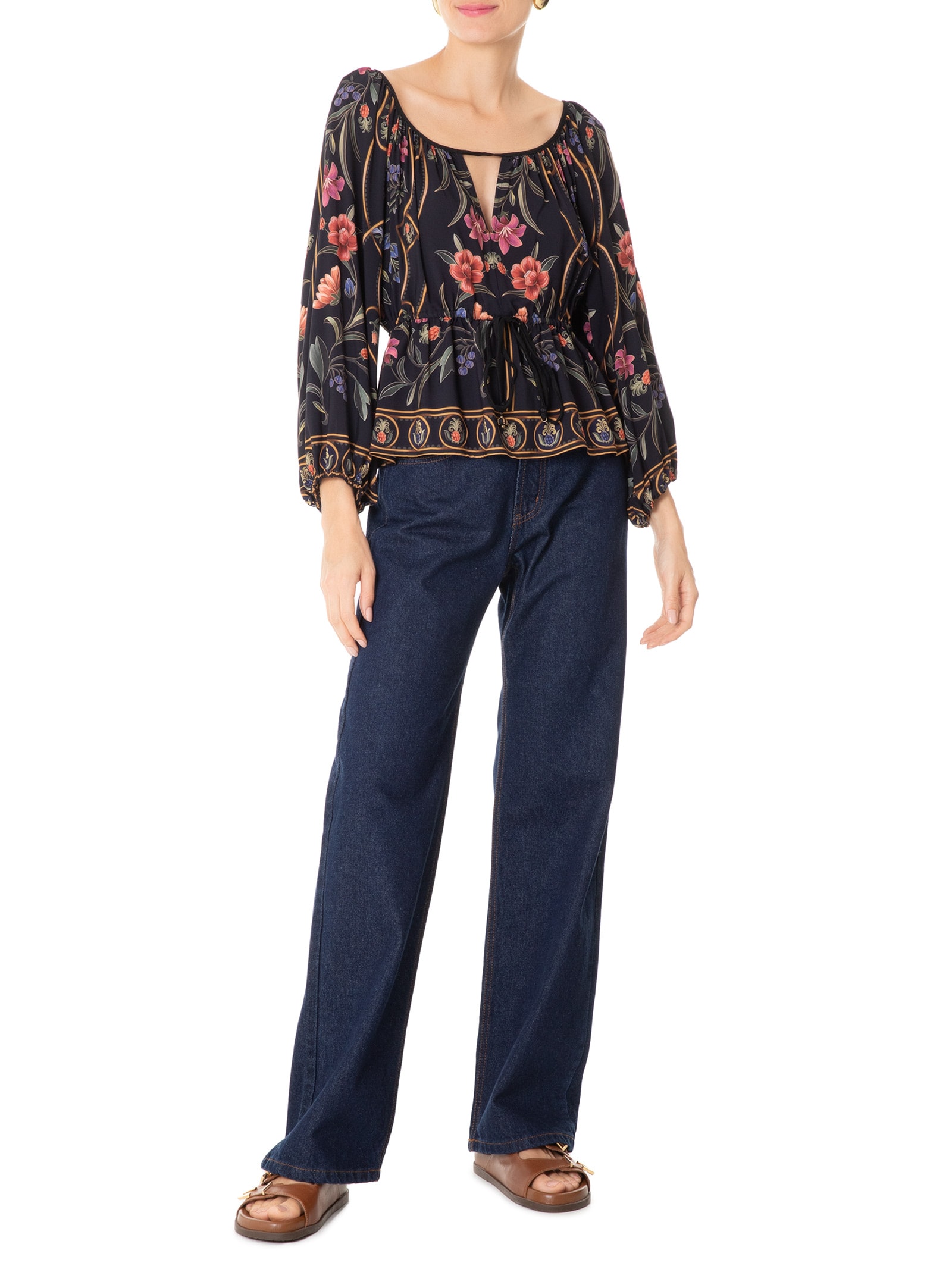 A bata preta é confeccionada em tecido leve sem elasticidade. A peça solta ao corpo possui decote redondo com recorte em V vazado e detalhe de viés, mangas longas com elástico embutido nos punhos, mix de estampa floral em cores contrastantes, recorte abaixo do busto com cordão embutido para ajuste e ponteiras em metal, e acabamento pespontado.