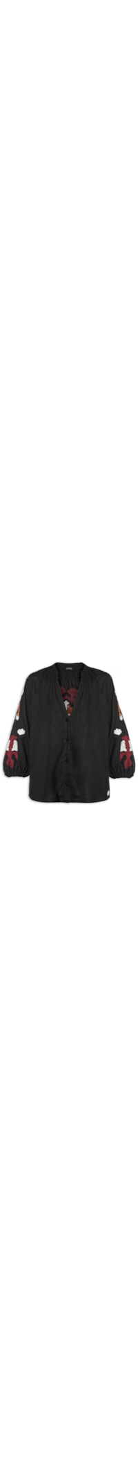 A bata preta é confeccionada em tecido leve com toque de linho sem elasticidade. A peça solta ao corpo possui decote mandarim com recorte em V, mangas longas amplas com ajuste nos punhos e aplicação de bordados figurativos em cores contrastantes e fechamento frontal por botões.