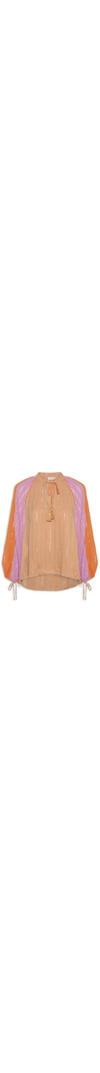 A bata rosa é confeccionada em tecido leve sem elasticidade. A peça solta ao corpo possui decote V com cordões alongados para amarração com tassel e miçangas nas ponteiras, mangas longas modelo raglan com recortes em cores contrastantes, padronagem listrada em fios de lurex nas cores prata e dourado e barra mullet* arredondada.
