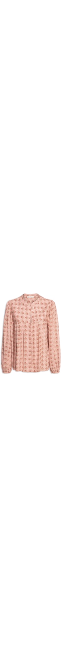 A bata rosa é confeccionada em tecido leve sem elasticidade. A peça solta ao corpo possui decote V, mangas longas modelo raglan com elástico aplicado no punho, padronagem de conchas e fios de lurex nas cores prata e dourado, barra mullet* e fechamento frontal por botões encapados.