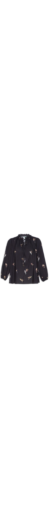 A bata preta é confeccionada em tecido leve sem elasticidade. A peça solta ao corpo possui colarinho mandarim com detalhes de franzidos e tiras estendidas para amarração, mangas longas com detalhes de franzidos nas cavas e elástico embutido nos punhos, mix de estampas em cores contrastantes e barra arredondada.