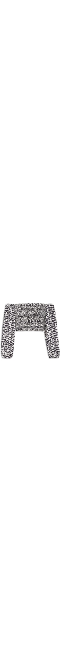 A bata preta é confeccionada em tecido leve sem elasticidade. A peça justa ao corpo possui decote ombro a ombro, mangas longas com elástico nos ombros e nos punhos, lastex aplicado na parte frontal e posterior, estampa abstrata em cores contrastantes e comprimento cropped*.