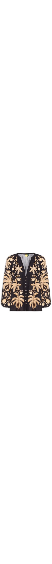 A bata preta é confeccionada em tecido leve sem elasticidade. A peça solta ao corpo possui decote V profundo, mangas modelo raglan longas com elástico embutido no punho, leve franzido posterior, fendas laterais, mix de estampas em cor contrastante e fechamento frontal por botões.