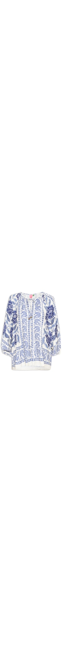 A bata branca é confeccionada em tecido leve sem elasticidade. A peça solta ao corpo possui decote recordo com tiras finas para amarração, mangas raglan 7/8 com elástico embutido nos punhos, mix de estampas em cores contrastantes, acabamento pespontado e fechamento frontal por botões.