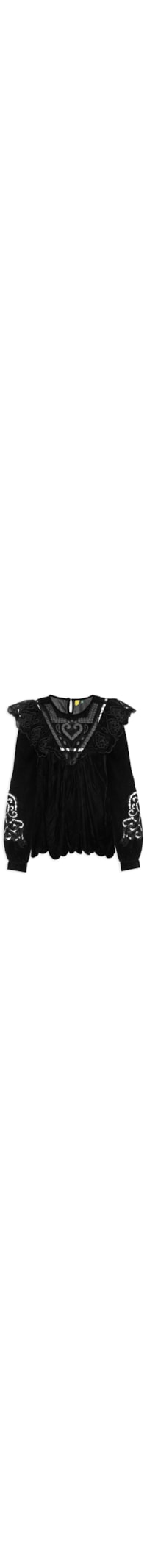 A bata preta é confeccionada em veludo sem elasticidade. A peça solta ao corpo possui decote redondo, mangas longas com abotoamento nos punhos, recorte posterior vazado com botões aplicados, sobreposição com detalhe de babado nas partes posterior e frontal, mix de bordados com detalhe de transparência e comprimento alongado.