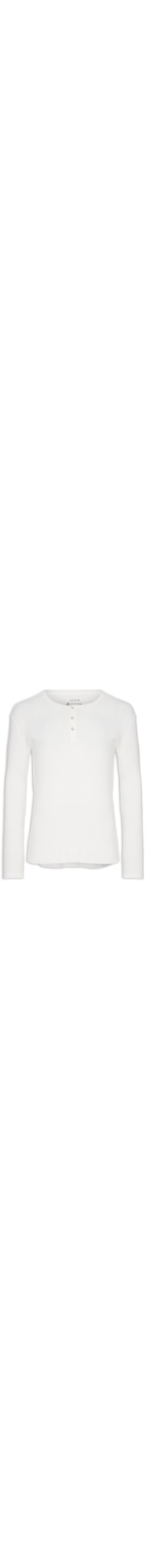 A bata off white é confeccionada em malha canelada com alta elasticidade. A peça de slim fit solta ao corpo possui gola redonda com botões de pressão aplicados, mangas longas, ombros estendidos e barra com acabamento em corte à fio.