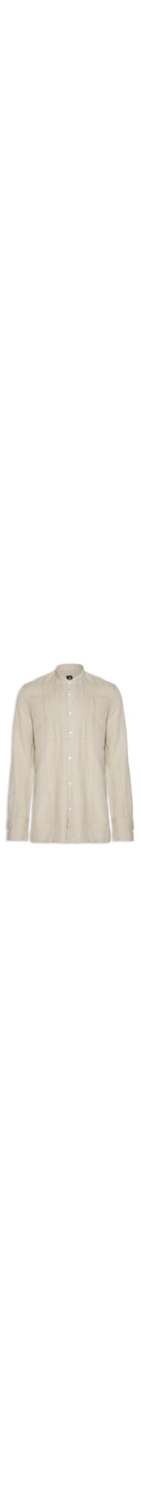 A bata bege é confeccionada em linho misto. A peça possui gola padre, mangas longas com abotoamento nos punhos, recorte frontal, barra mullet, shape solto, caimento reto, acabamento pespontado e fechamento frontal por botões.