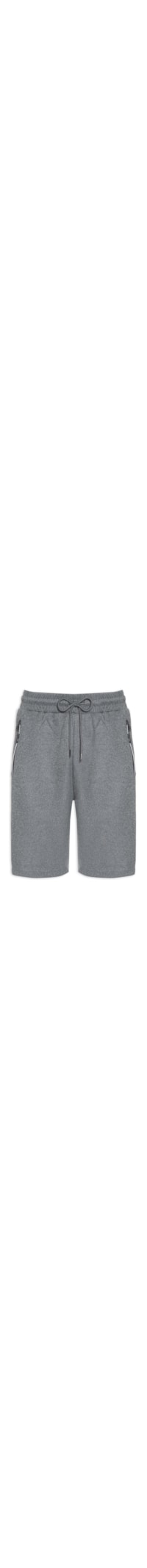 A bermuda cinza é confeccionada em malha encorpada. A peça possui cós elástico com cordão embutido, bolsos frontais com fechamento por zíper, fechamento frontal por amarração, comprimento curto, caimento reto e acabamento pespontado.