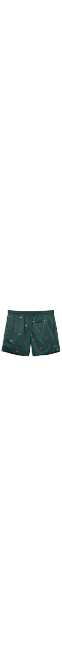 Bermuda de banho com bordado de melancias, confeccionada em tecido de textura macia e densa, à prova d’água e de secagem rápida. Possui forro interno em formato de cueca, feito em microfibra macia no mesmo tom. A cintura com elástico e cordão conta com uma prática abertura lateral para chaves.