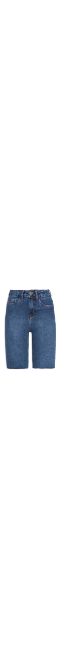 A bermuda azul é confeccionada em sarja com lavagem jeans. A peça possui cintura média, cós com passantes aplicados, tag da marca bordada na parte posterior do cós, five pockets*, rebites com o nome da marca aplicados nos bolsos frontais, barra com acabamento por corte à fio, comprimento curto, shape justo, caimento reto, acabamento pespontado e fechamento frontal por botão e zíper.