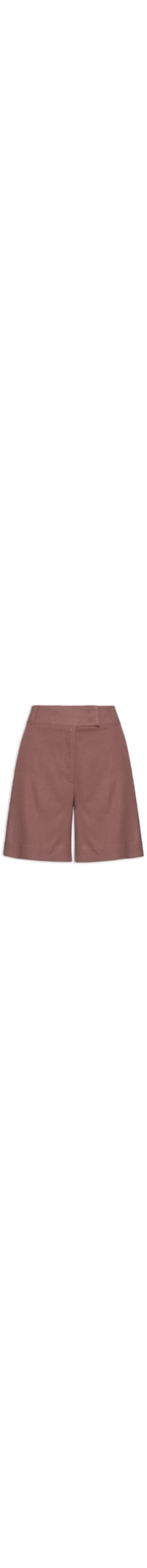 A bermuda marrom é confeccionada em linho misto sem elasticidade. A peça possui cintura média, cós com passantes aplicados, pregas frontais sutis, bolsos frontais funcionais, bolsos posteriores decorativos com lapela, modelagem reta, comprimento acima do joelho e fechamento frontal por zíper e colchetes.