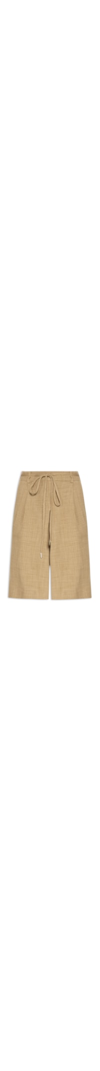 A bermuda marrom é confeccionada em tecido leve com baixa elasticidade. A peça solta ao corpo possui cintura alta, cós com passantes aplicados, bolsos frontais modelo faca, bolsos posteriores decorativos, tag metalizada da marca na parte posterior, pregas frontais e fechamento lateral por zíper invisível. Acompanha tira na mesma cor e tecido para uso opcional.