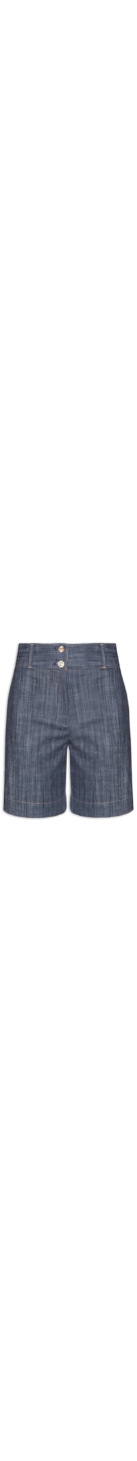 A bermuda azul é confeccionada em sarja com lavagem em jeans e baixa elasticidade. A peça solta ao corpo possui cintura alta, cós com passantes, pences posteriores, bolsos posteriores decorativos, bolsos frontais embutidos, efeito estonado e fechamento frontal por botões e zíper.
