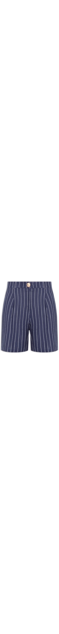 A bermuda azul marinho é confeccionada em tecido leve com toque de linho com baixa elasticidade. A peça solta ao corpo possui cintura alta, cós com passantes aplicados, bolsos frontais de modelo faca, bolso posterior decorativo, padronagem de listras em cor contrastante preto e fechamento frontal por zíper e botão.