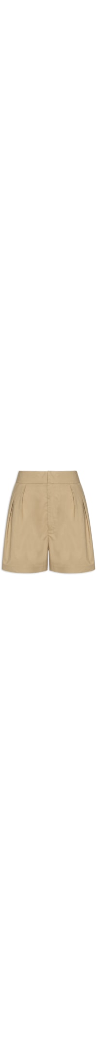 A bermuda bege é confeccionada em tecido leve sem elasticidade. A peça sotla ao corpo possui cintura alta, cós com elástico embutido na parte posterior, pregas frontais, fendas laterais, comprimento curto e fechamento frontal em zíper e colchetes.