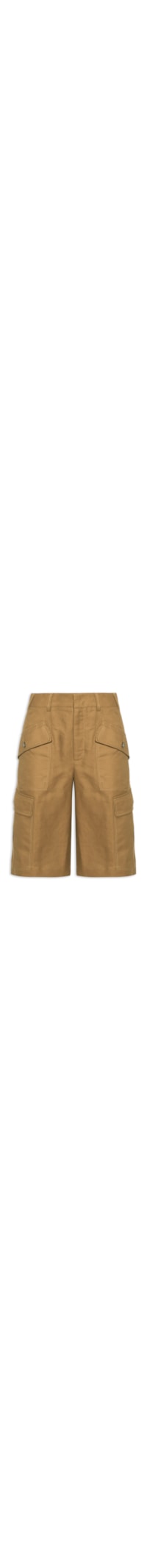 A bermuda verde é confeccionada em linho misto sem elasticidade. A peça possui cintura alta, cós com passantes aplicados, bolsos frontais utilitários com lapela e botão, bolsos laterais sobrepostos com aba e botão, bolsos posteriores com lapela e botão, barra reta e fechamento frontal por zíper e colchetes.