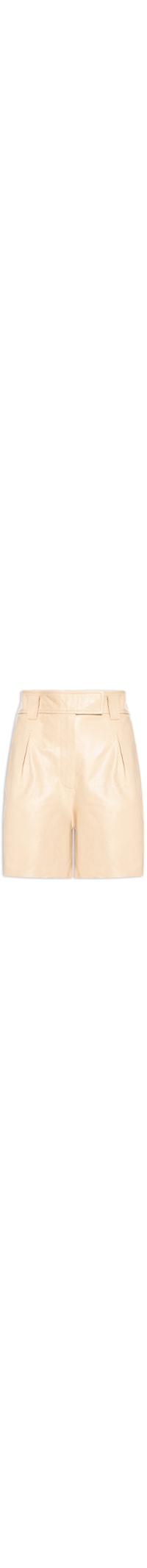 A bermuda bege é confeccionada em couro sem elasticidade. A peça solta ao corpo possui cintura alta, cós com passantes aplicados, bolsos frontais modelo faca, bolsos posteriores embutidos, pregas posteriores e frontais, comprimento curto e fechamento frontal em zíper e botão.