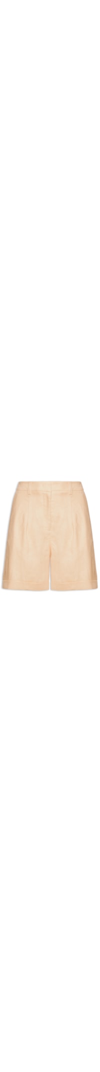 A bermuda bege é confeccionada em linho sem elasticidade. A peça solta ao corpo possui cintura alta, cós com passantes, pences posteriores, bolsos posteriores decorativos, bolsos frontais modelo faca, pregas frontais, barras italianas e fechamento frontal por colchete e zíper.