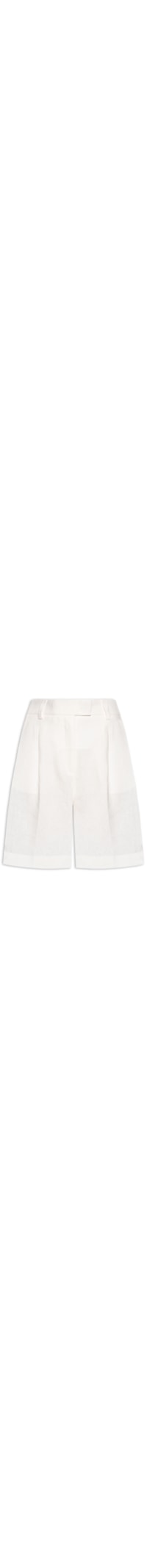 A bermuda branca é confeccionada em linho sem elasticidade. A peça solta ao corpo possui cintura alta, cós com passantes, bolsos frontais de modelo faca, bolsos posteriores embutidos, comprimento curto e fechamento frontal por zíper e botão.