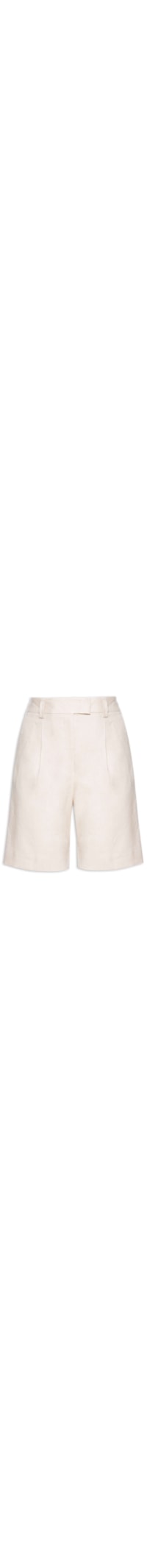 A bermuda bege é confeccionada em linho sem elasticidade. A peça solta ao corpo possui cintura alta, cós com passantes aplicados, bolsos frontais de modelo faca, pregas frontais, bolsos posteriores decorativos, comprimento alongado e fechamento frontal por botão, colchete e zíper.