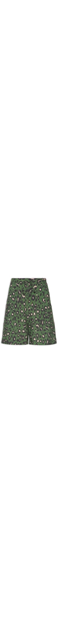 A bermuda animal print é confeccionada por tecido leve sem elasticidade. A peça solta ao corpo possui cintura alta, passantes aplicados no cós, cordão e elástico embutido no cós, bolsos frontais, pences frontais, padronagem animal print e comprimento curto.