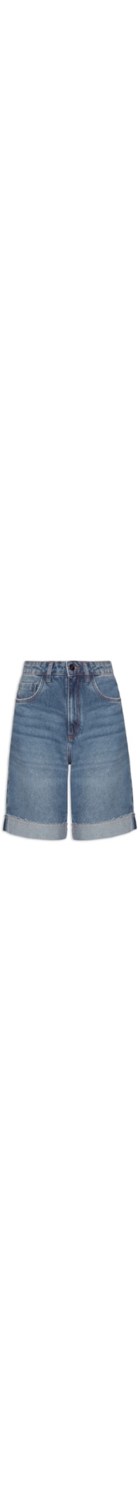 A bermuda azul é confeccionada por sarja com lavagem em jeans sem elasticidade. A peça solta ao corpo possui cintura média, passantes aplicados no cós, five pockets*, recortes posteriores, barra italiana com corte a fio e fechamento frontal por zíper e botão.