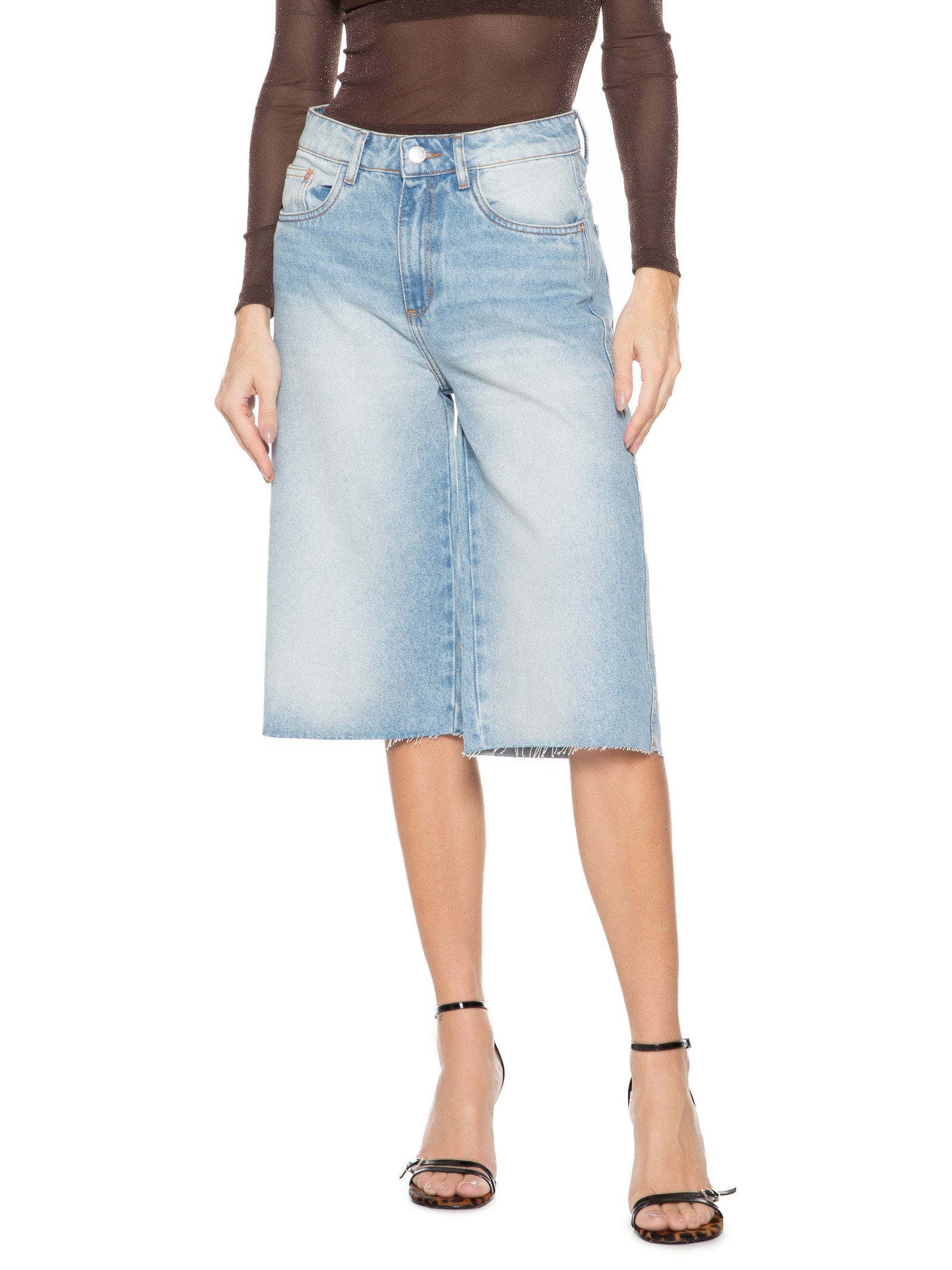 A bermuda azul é confeccionado em sarja com lavagem jeans sem elasticidade. A peça solta ao corpo possui cós com passantes, cintura alta, five pockets*, recortes frontais e posteriores, detalhe de rebites, barra em corte a fio, comprimento na altura do joelho e fechamento frontal por botão e zíper.
