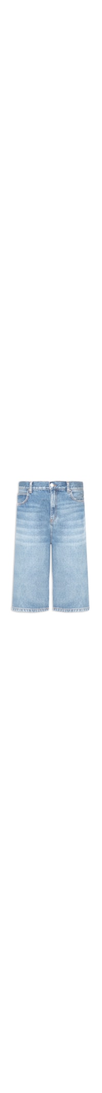 A bermuda azul é confeccionada em sarja com lavagem em jeans sem elasticidade. A peça solta ao corpo possui cintura alta, cós com passantes aplicados, five pockets*, tag da marca aplicada no cós posterior, efeito estonado e fechamento frontal por botão e zíper.