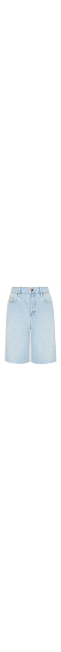 A bermuda azul é confeccionada em sarja com lavagem jeans sem elasticidade. A peça solta ao corpo possui cintura média, cós com passantes, tag da marca aplicado na parte posterior, five pockets*, acabamento pespontado, recorte posterior, barra cortada à fio e fechamento frontal por botão e zíper.