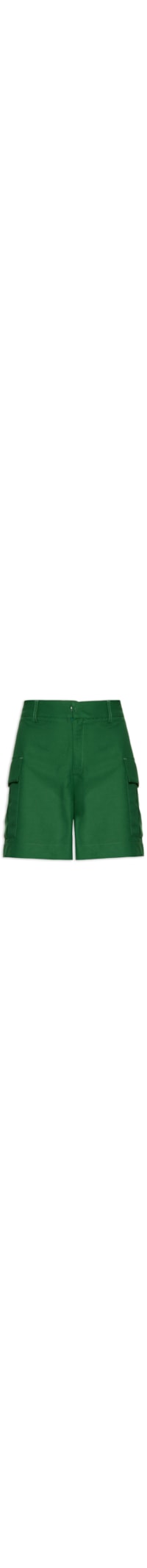A bermuda verde é confeccionada em tecido leve com toque de linho sem elasticidade. A peça solta ao corpo possui cintura alta, cós com passantes e tag da marca aplicada em metal na parte posterior, pences posteriores, bolsos laterais modelo cargo e fechamento frontal por botões e zíper.