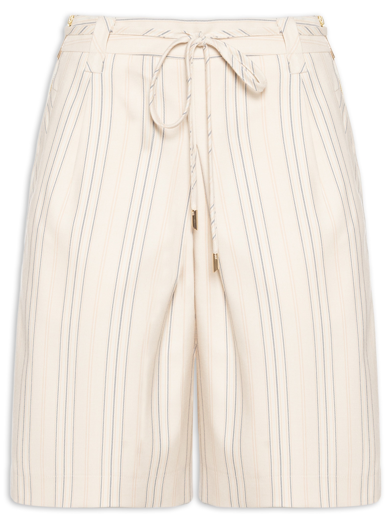 A bermuda bege é confeccionada em tecido leve sem elasticidade. A peça solta ao corpo possui cintura alta, cós com passantes, bolsos frontais, bolso posterior decorativo, pences posteriores, pregas frontais, padronagem risca de giz e fechamento lateral por zíper. Acompanha cordão em mesmo tecido para amarração opcional.