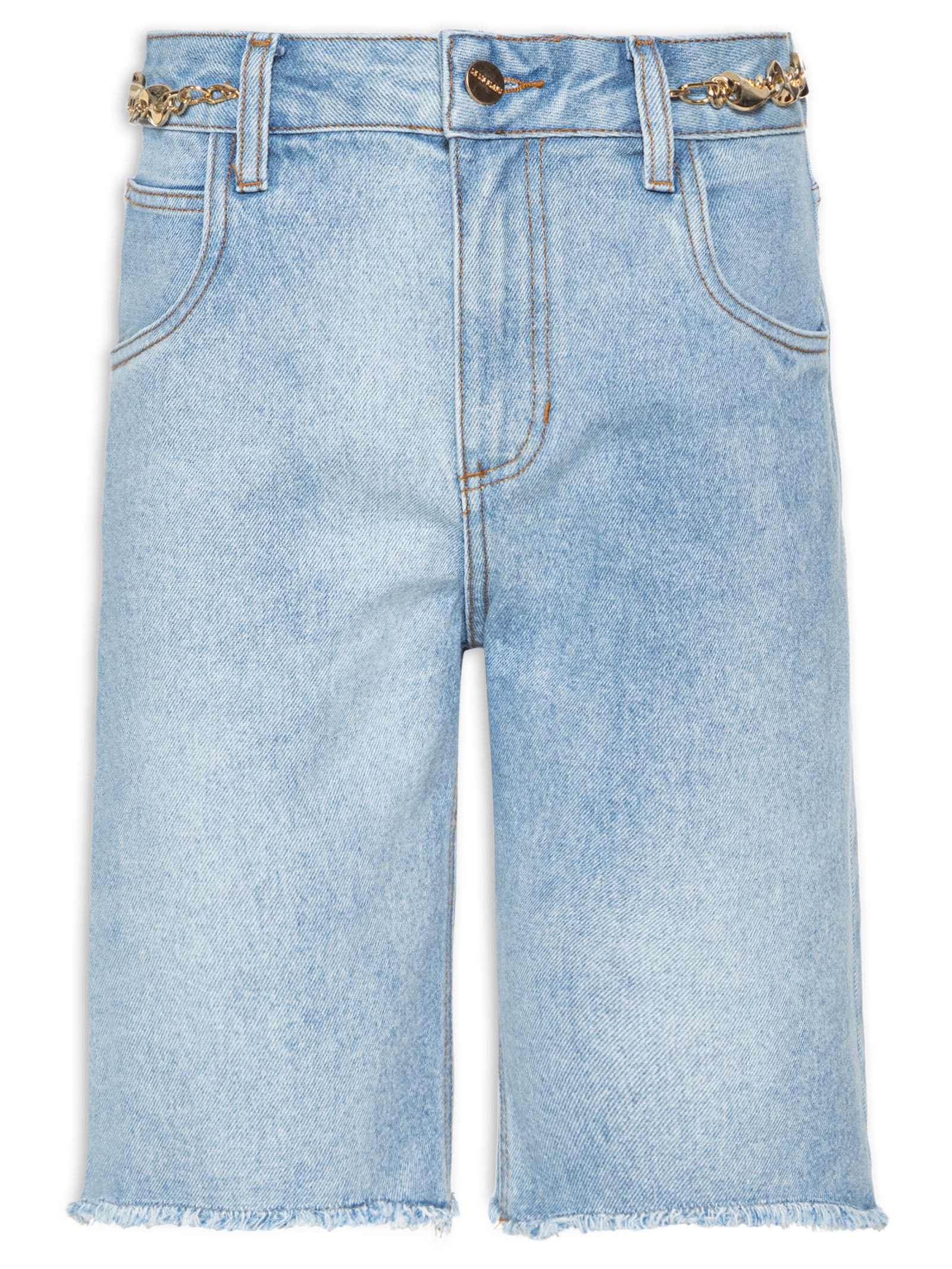 A bermuda azul é confeccionada em sarja com lavagem em jeans sem elasticidade. A peça solta ao corpo possui cintura alta, cós com passantes e aplicação frontal de correntes metálicas removíveis, recorte posterior, five pockets*, logo da marca aplicado em metal no bolso posterior, efeito estonado, barras assimétricas desfiadas e fechamento frontal por botão e zíper.