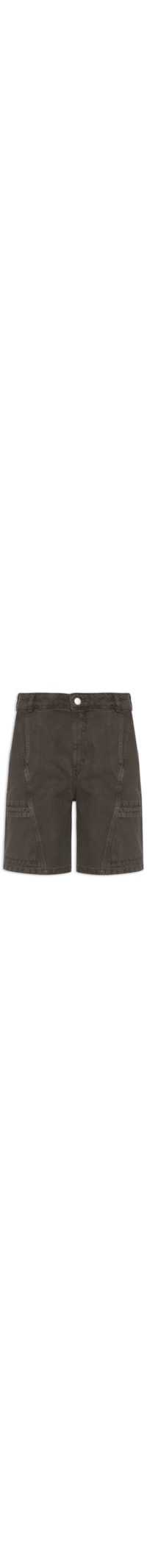 A bermuda marrom é confeccionada em sarja com baixa elasticidade. A peça solta ao corpo possui cintura alta, passantes aplicados no cós, bolsos frontais de modelo faca, bolsos posteriores embutidos, recortes frontais e posteriores, comprimento médio e fechamento frontal por zíper e botão.