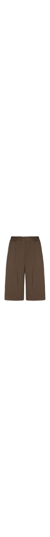 A bermuda marrom é confeccionada em tecido leve com baixa elasticidade. A peça solta ao corpo possui cintura alta, cós com passantes aplicados, bolsos frontais modelo faca, bolsos posteriores decorativos, pregas frontais, padronagem risca de giz em cor contrastante, comprimento curto e fechamento frontal por zíper e colchete interno.