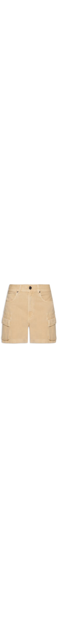 A bermuda bege é confeccionada em sarja sem elasticidade. A peça solta ao corpo possui cintura alta, cós com passantes aplicados, *five pockets, dois bolsos laterais com aba sobreposta, comprimento curto, e fechamento frotnal por zíper e botão.